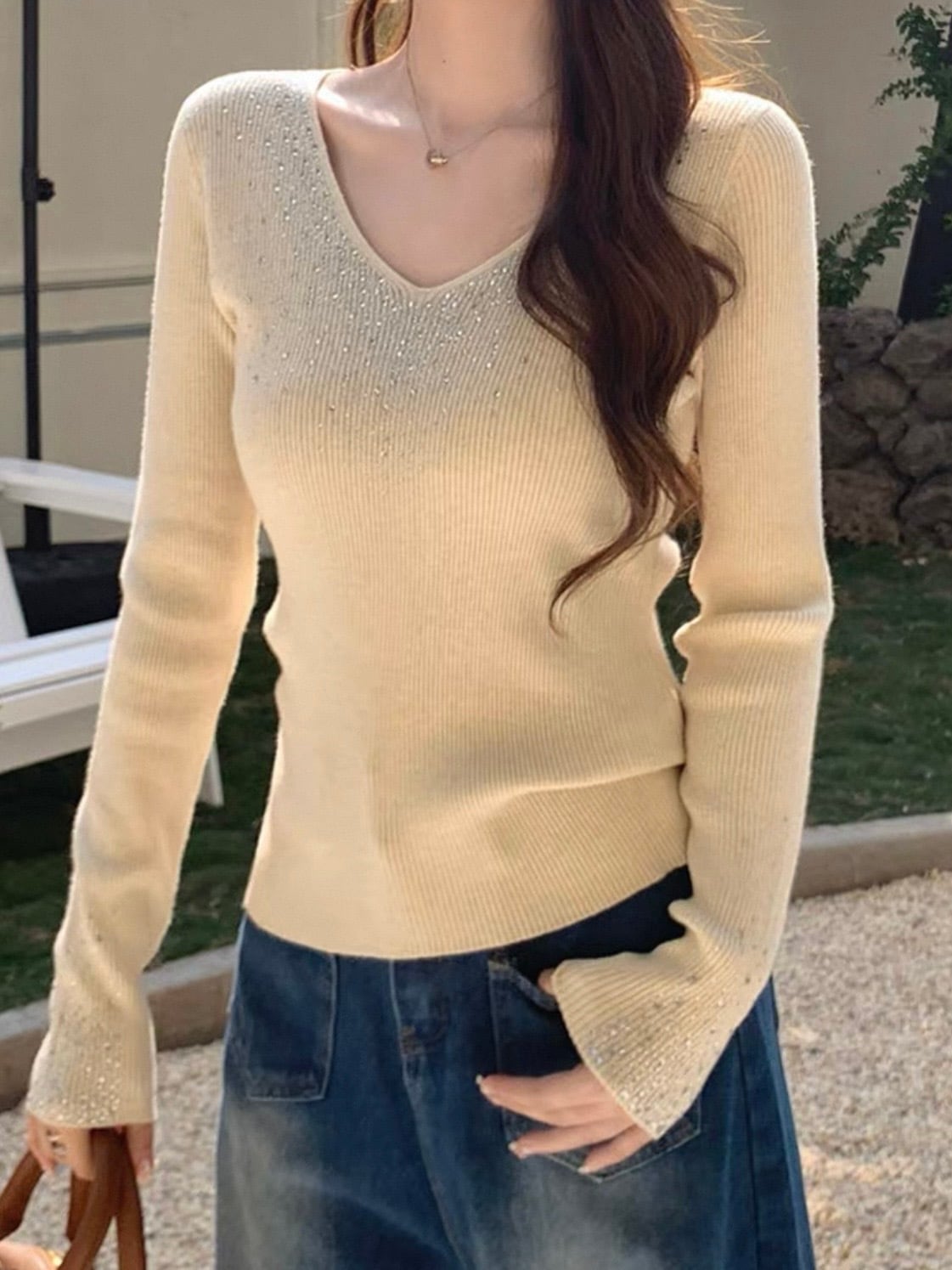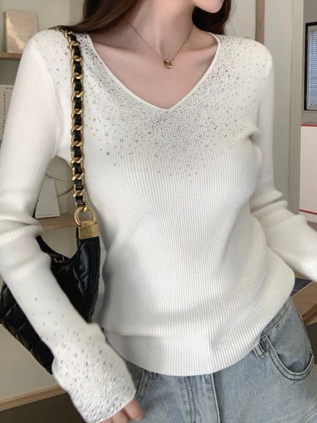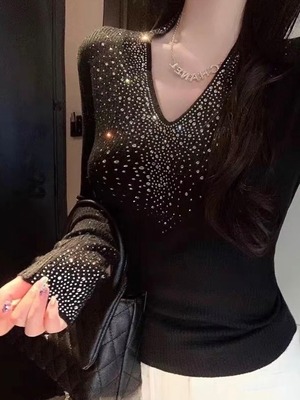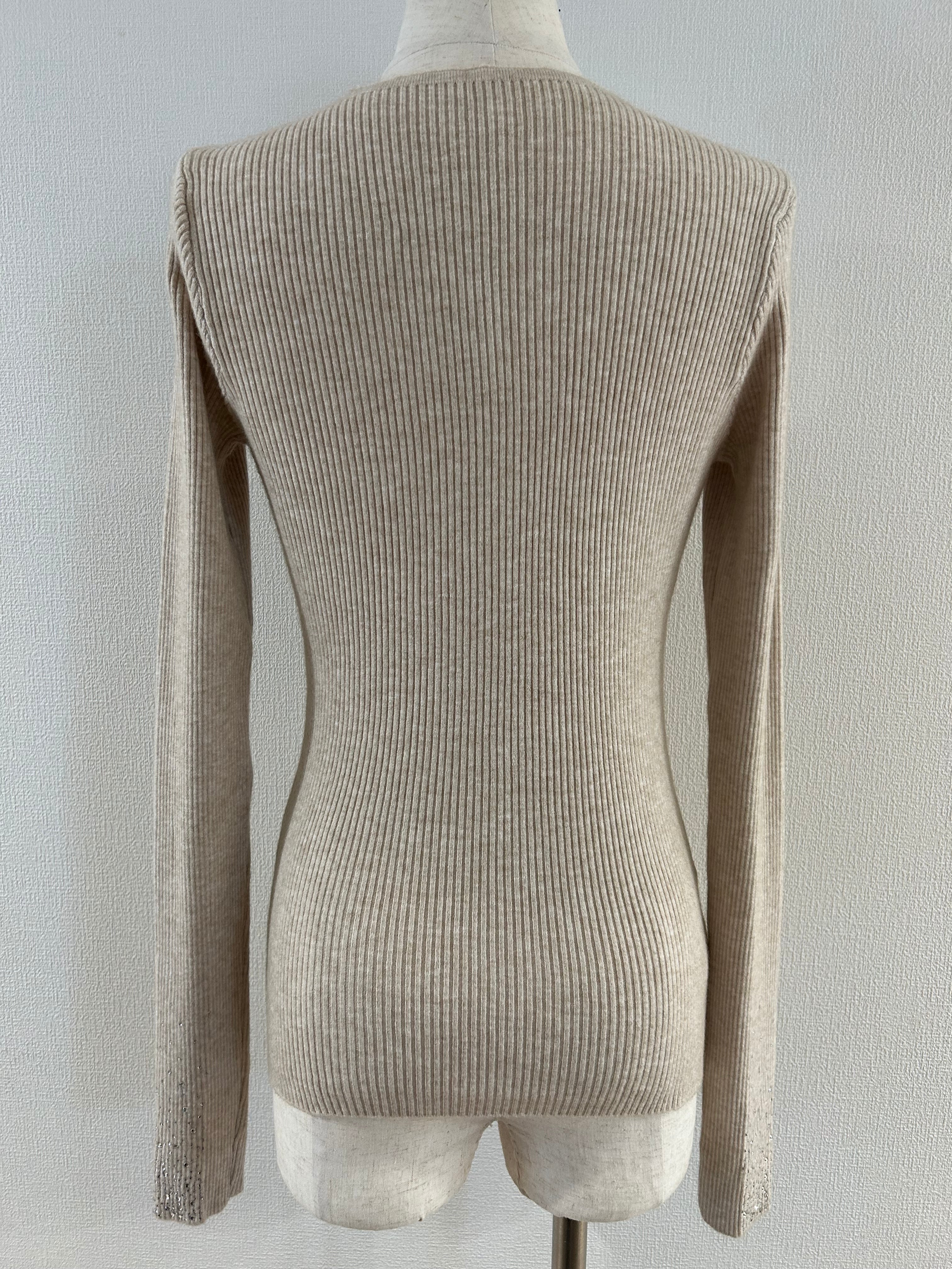インパクトのあるキラキラ袖口と、Vカットの胸周りが際立つオフショル カットソー!今季注目のスタイルで、パーティーからカジュアルシーンまで幅広く活躍します。華やかなデザインは、コーディネートの主役としてピッタリです。