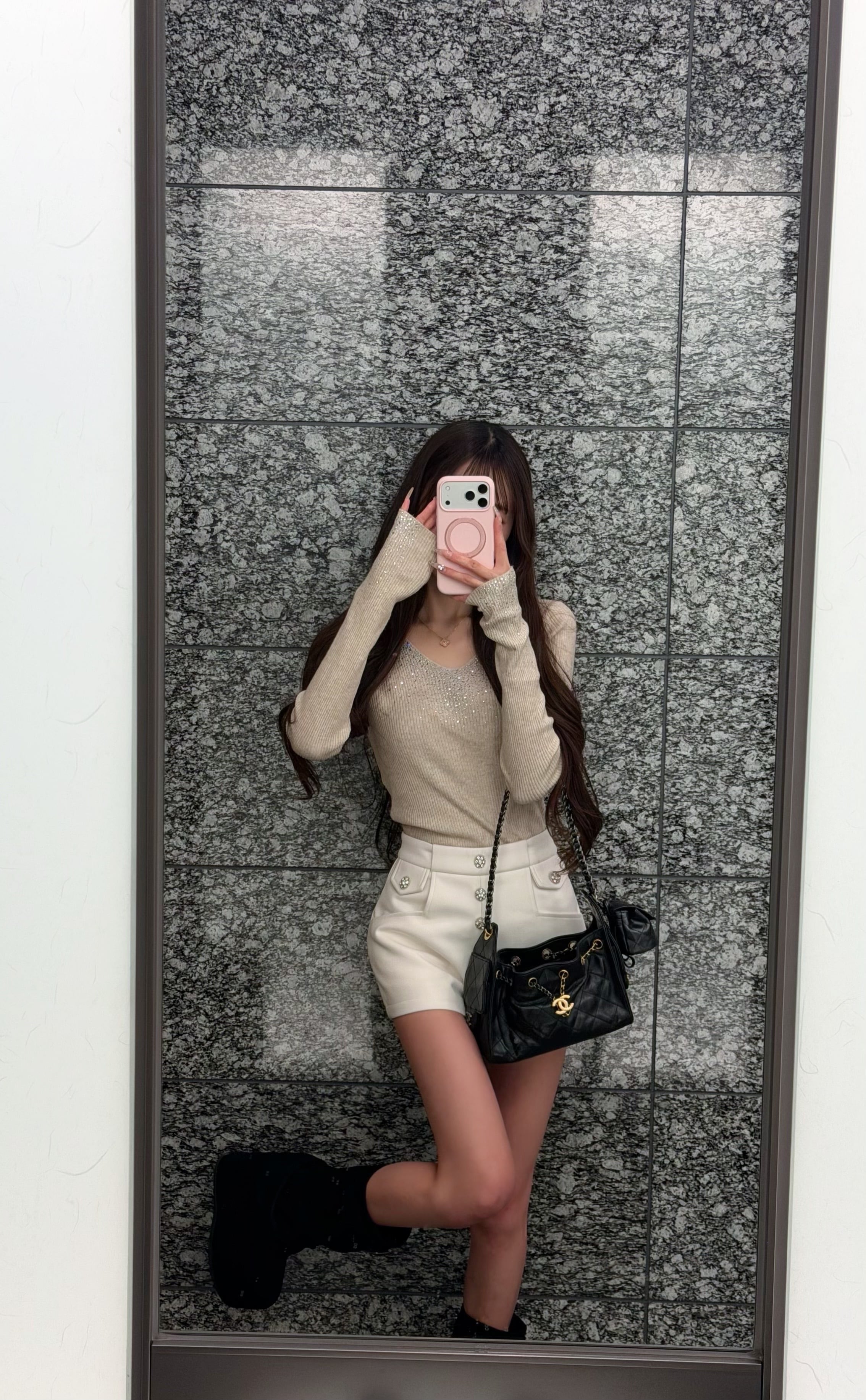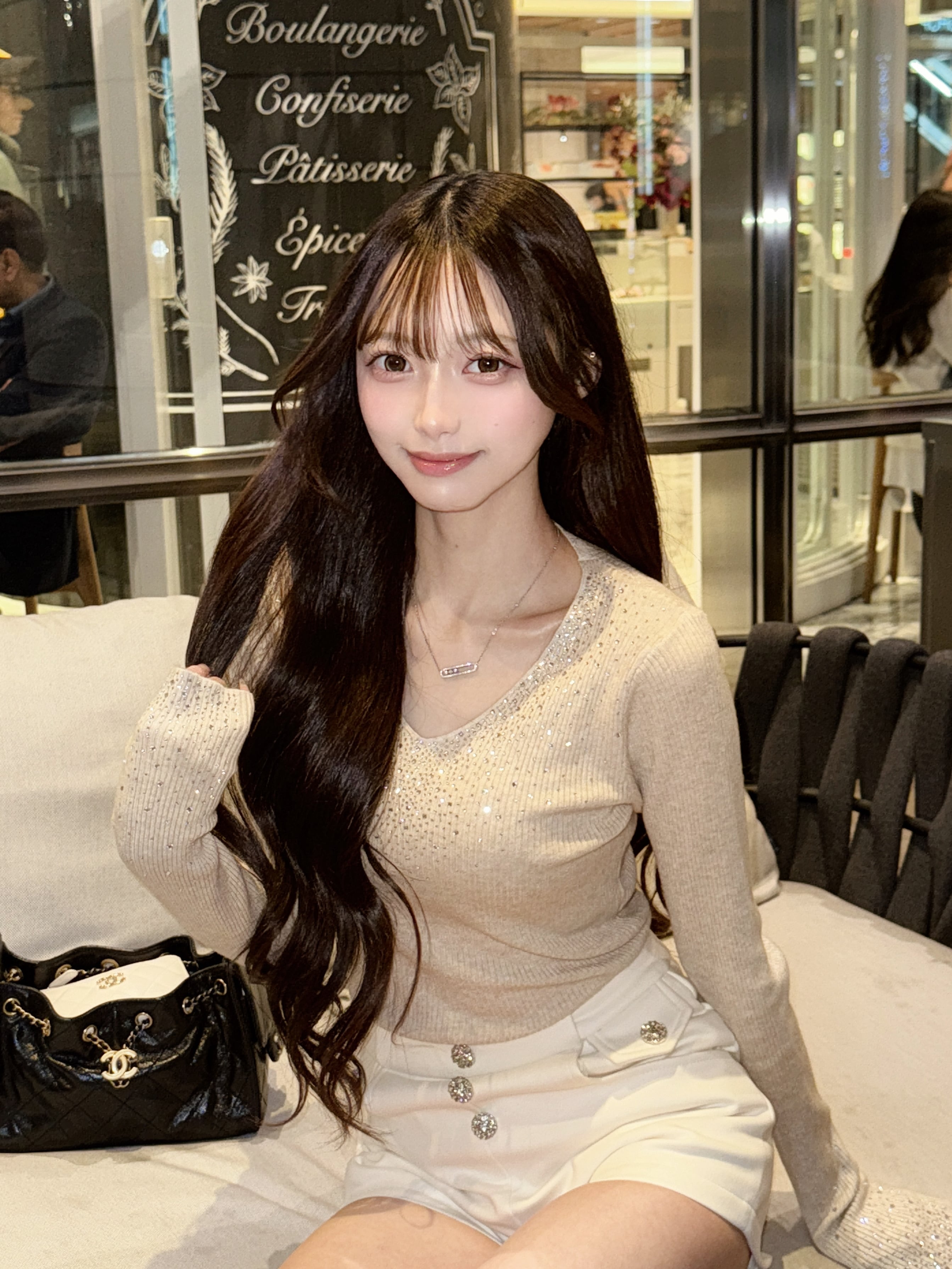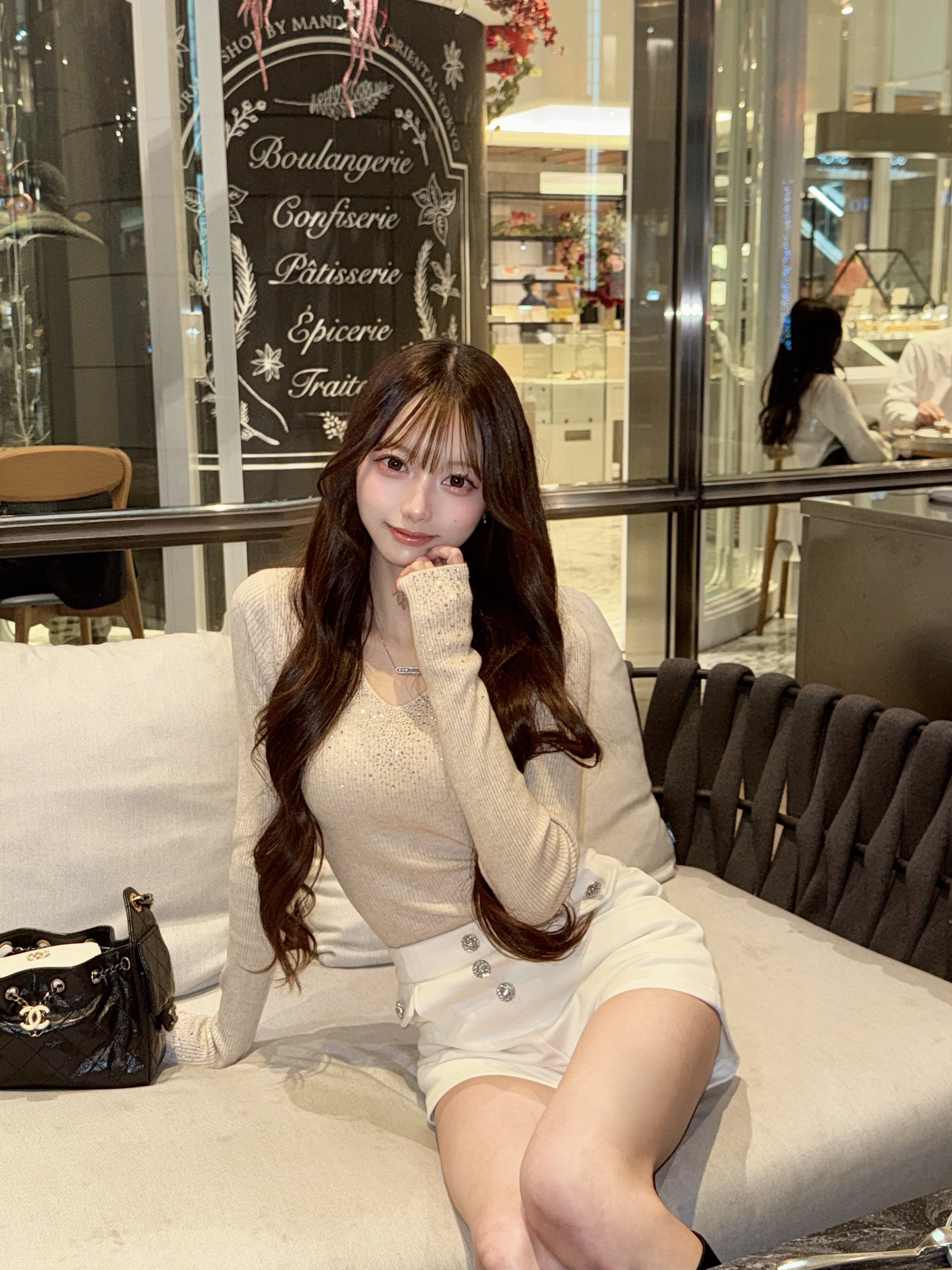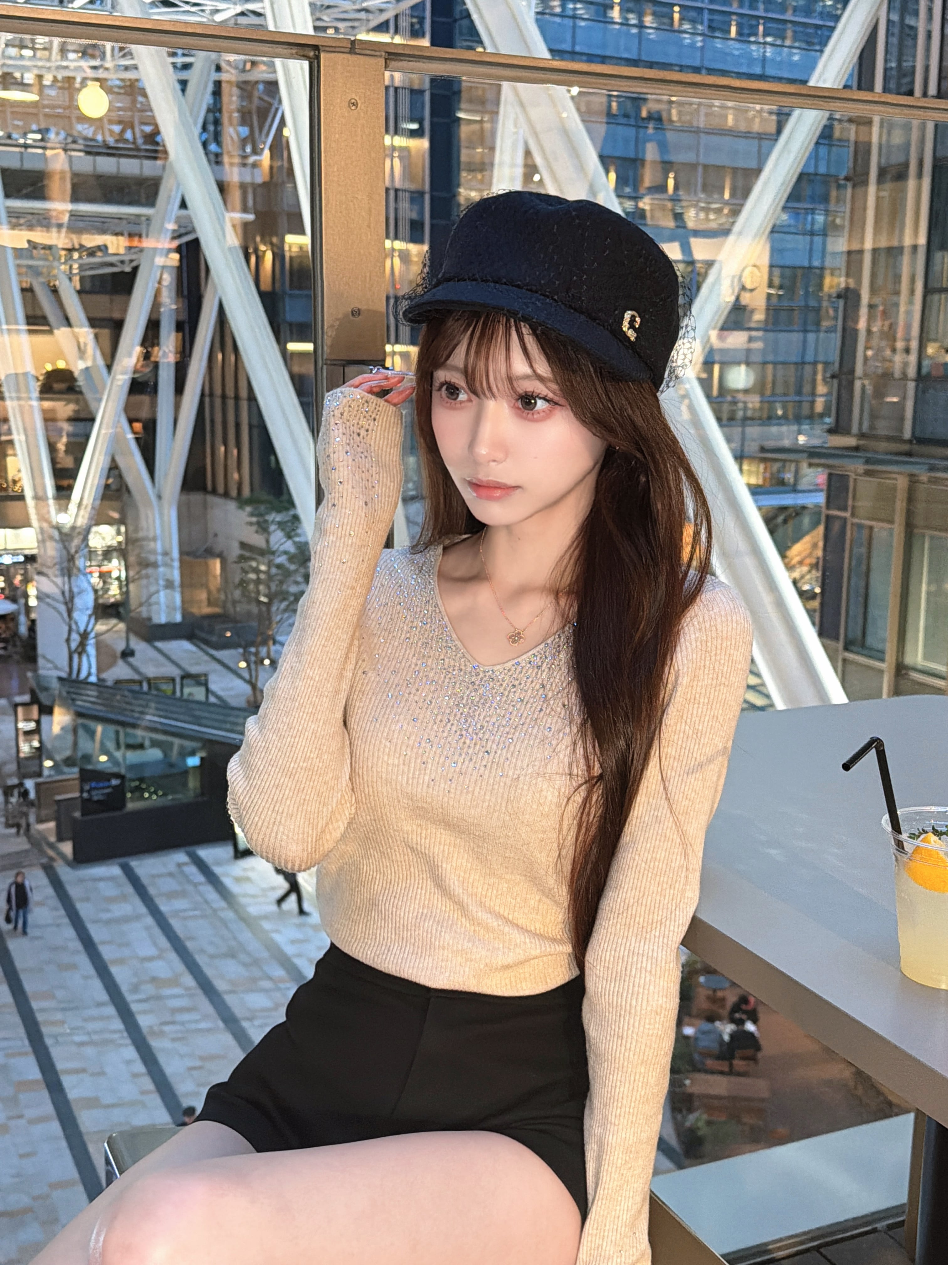 インパクトのあるキラキラ袖口と、Vカットの胸周りが際立つオフショル カットソー!今季注目のスタイルで、パーティーからカジュアルシーンまで幅広く活躍します。華やかなデザインは、コーディネートの主役としてピッタリです。