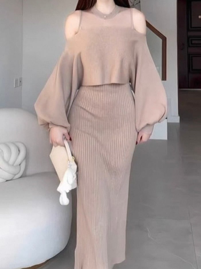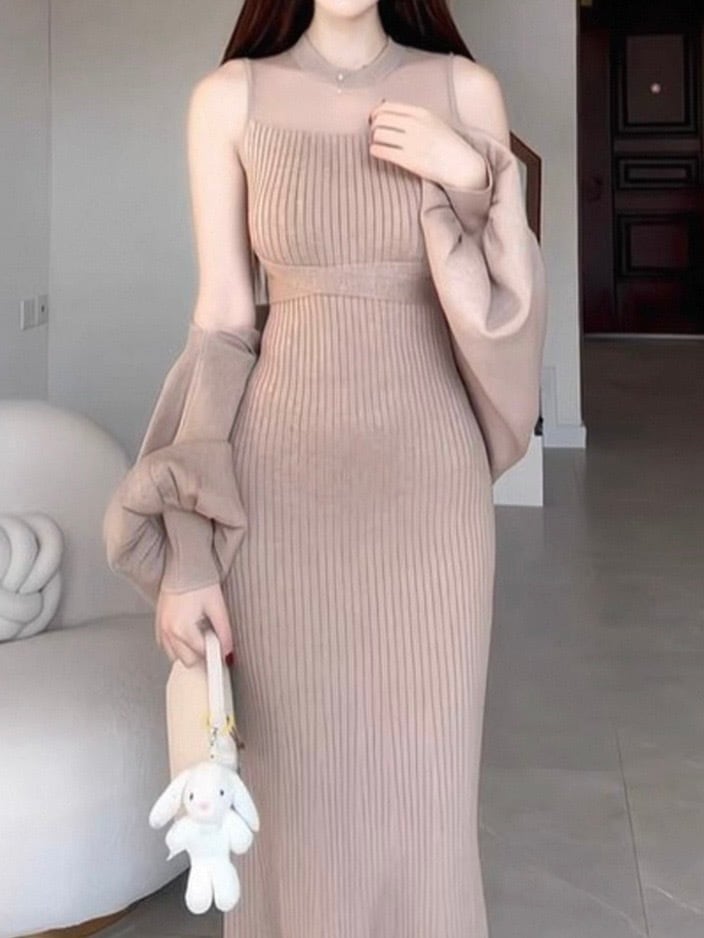 洗練されたデザインが魅力のロングニットワンピースの登場です!デコルテ部分のレースが印象的で、女性らしさを引き立てます。ワンピースとカーディガンのセットになっているため、コーディネートが楽ちんなのも嬉しいポイントです。